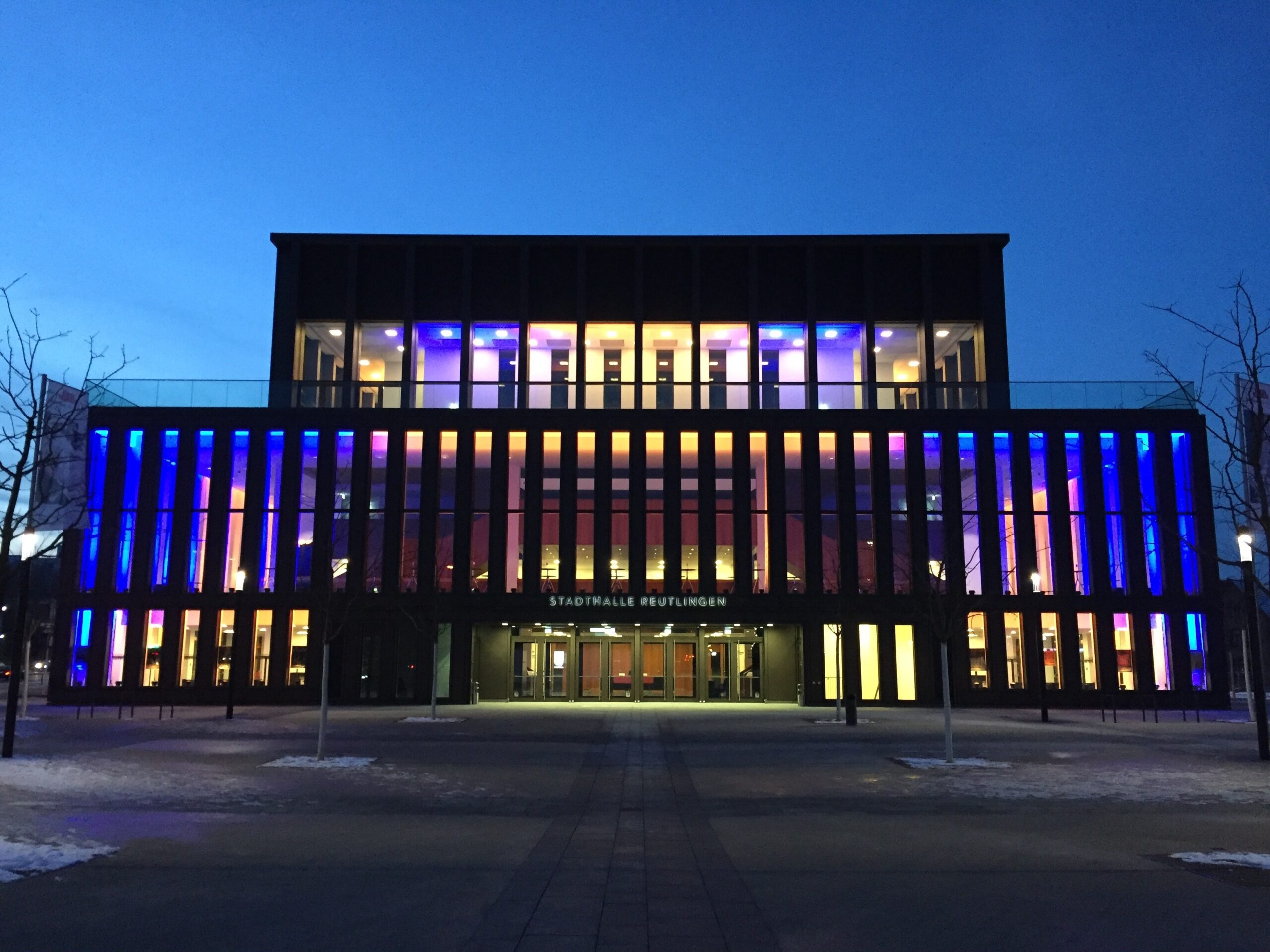 Beleuchtet kommt die Stadthalle Reutlingen nochmals besser zur Geltung – häufig auch mit besonderer Bedeutung zur Unterstützung der guten Sache von Rare Desease Day bis Weltmädchentag. (Bild: Stadthalle Reutlingen)