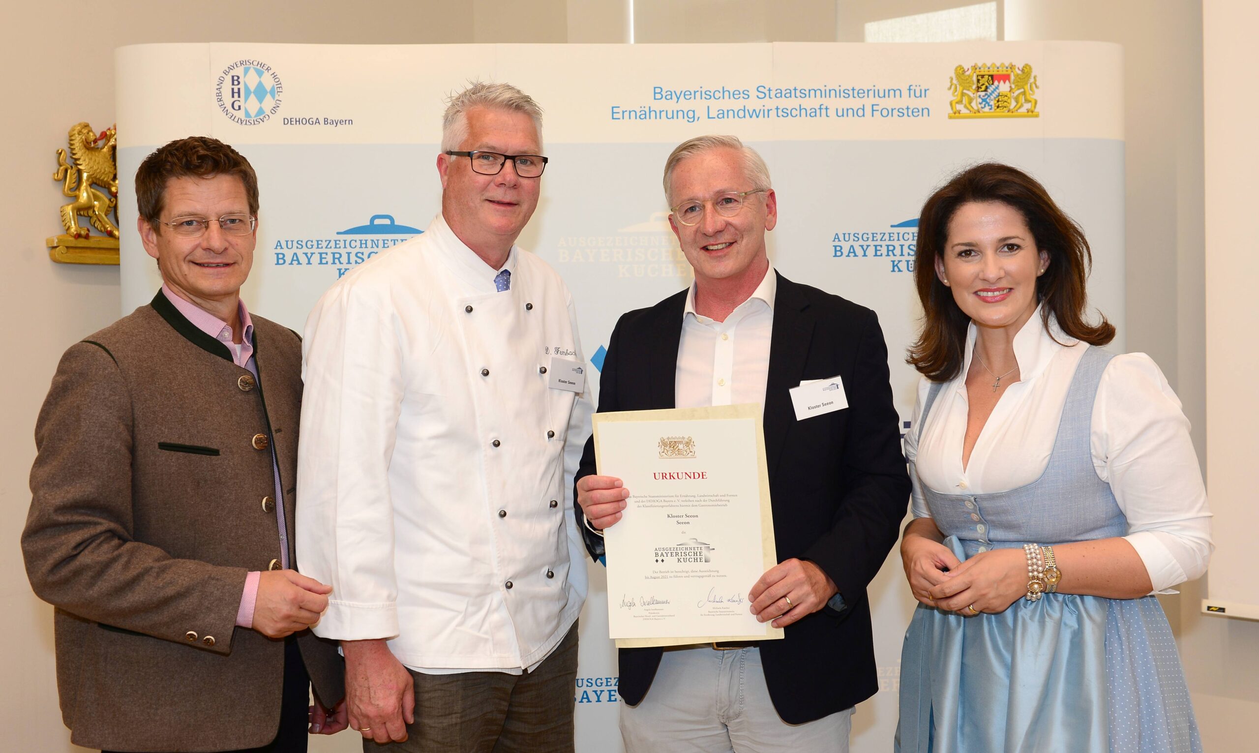 Jürgen Lochbihler (Schatzmeister Dehoga Bayern), Dieter Fembacher (Küchenchef Kloster Seeon), Gerald Schölzel (Geschäftsführer Kloster Seeon), Michaela Kaniber (Landwirtschaftsministerin)