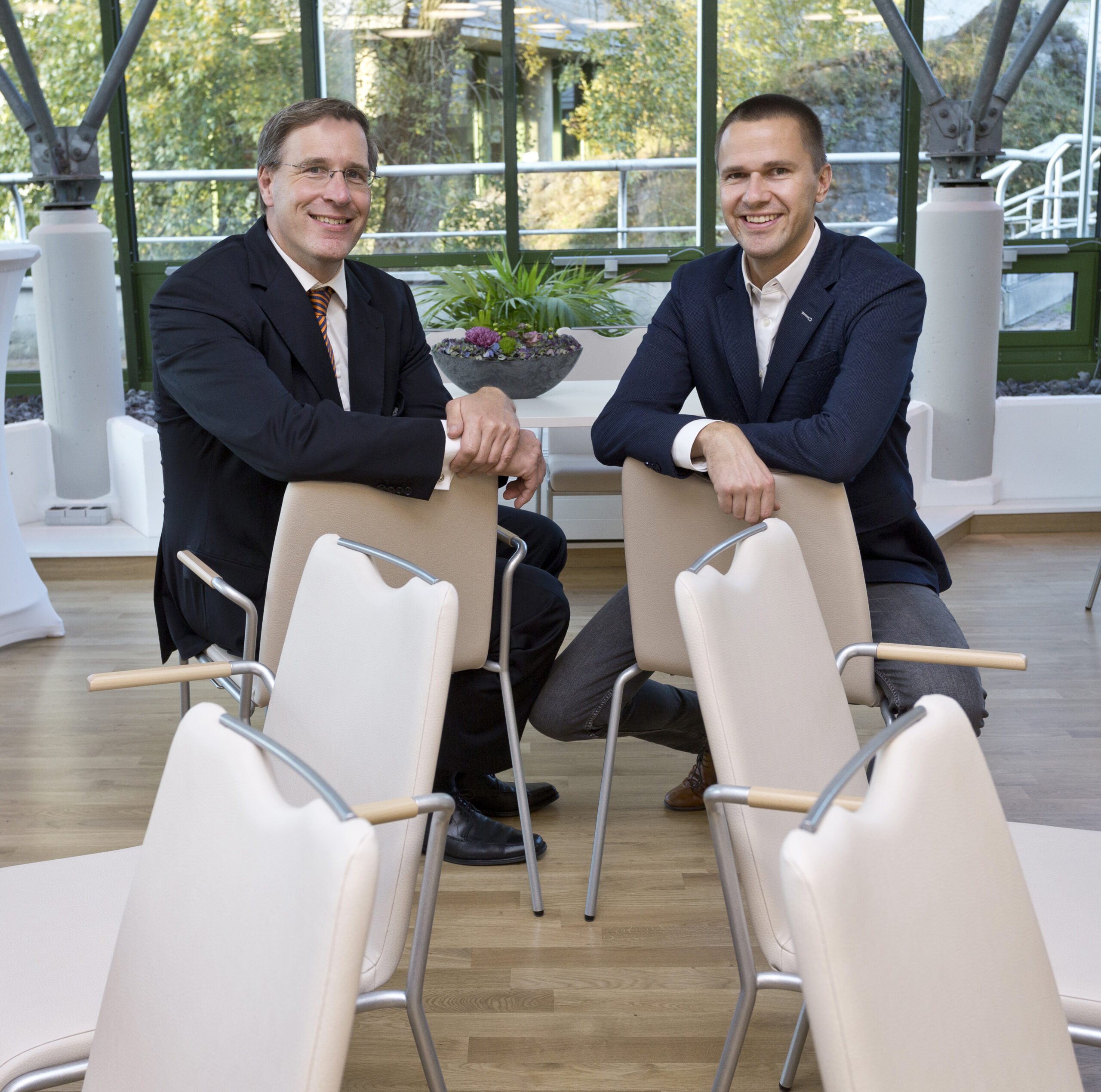 Strahlende Gesichter nach einem erfolgreichen Projektabschluss – Volker Wolf (Leitung Gastronomie Stadthalle Hagen) und Tobias Günther (Geschäftsführer tg contor GmbH) testen die kürzlich erneuerten Stühle und Tische im Restaurant des Kongress- und Eventparks Stadthalle Hagen. Ende Oktober wurde das Restaurant des Kongress- und Eventparks Stadthalle Hagen neu eröffnet und erstrahlt seither im erfrischenden Crème-weiß der neuen Möblierung.