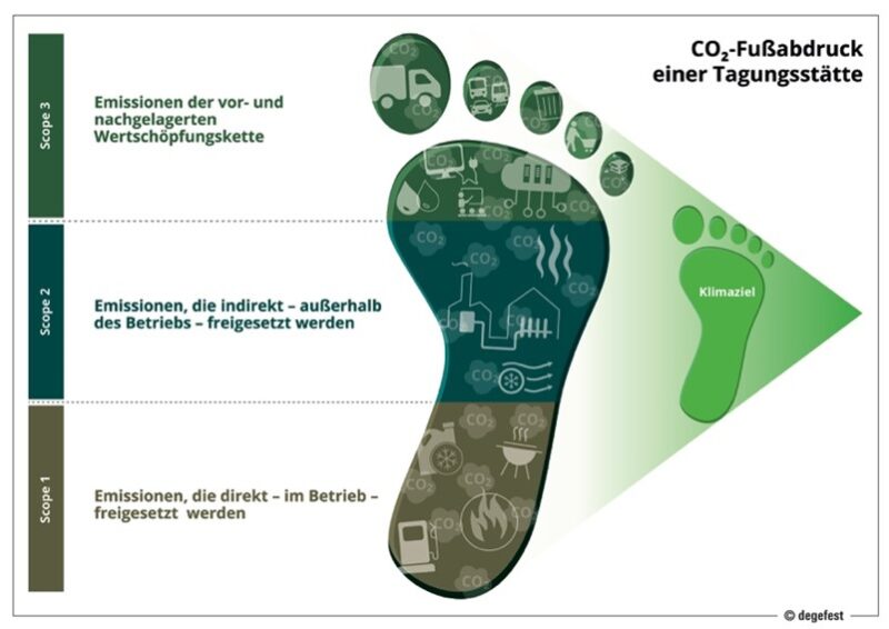 Der CO2-Fußabdruck eines Veranstaltungshauses ist immer die Summe aller Treibhausgasemissionen, die im Rahmen sämtlicher Tätigkeiten der Unternehmung direkt oder indirekt erzeugt werden. Gleichwohl sollten Sie bei der Erstellung der Scopes die o. a. Differenzierung einhalten. Dazu benötigen Sie die Verbrauchswerte und die Angabe der damit verbundenen Treibhausgasemissionen – bezogen auf einen vergleichbaren Zeitraum (i.d.R. ein Jahr). In Verbindung mit bestehenden Kennzahlen aus Ihrem Haus können Sie so weitere Kennzahlen bilden – z.B. CO2-Emissionen pro Gast, pro m² Fläche – und schaffen damit einen Wert, an dem sich Ihre Kunden orientieren können. Je differenzierter Sie diese von Beginn an erfassen, desto aussagekräftiger sind die daraus gewonnenen Informationen für alle Entscheidungen – auf Ihrer und auf der (Veranstalter-)Kundenseite. Selbstverständlich gehören auch die damit verbundenen Kosten dazu.