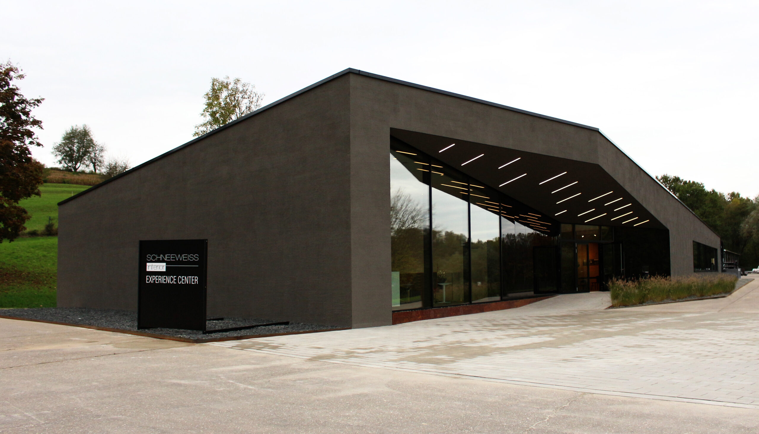 Die Entwürfe für das neue Experience Center wurden nach Ideen von Bauherr Jürgen Dreher vom Architekturbüro Keienburg Architekten zu Papier gebracht. Die Rolle von Schneeweiss Interior als Gestalter des Fortschritts spiegelt sich in Bauplänen, Werkstoffen und Interior Design wider. Das umgesetzte Multi-Space-Raumkonzept fördert die interdisziplinäre Zusammenarbeit und die Innovationskraft der Mitarbeiter. Hochmoderne Glasfaseranschlüsse garantieren Down- und Upload riesiger Datenmengen in rasantem Tempo. Eine Deckenhöhe von bis zu 5,50 Metern definiert mit eingelassenen Lichtlinien Raumluxus neu, die puristischen Böden aus Beton sind blank, poliert, gewachst. Das ins Raumkonzept integrierte Holz aus nachhaltiger Herstellung hingegen sorgt für Behaglichkeit und Wohlfühlatmosphäre. Von außen macht die futuristische Fassade neugierig, die Designaffinität des Gebäudes sticht ins Auge.