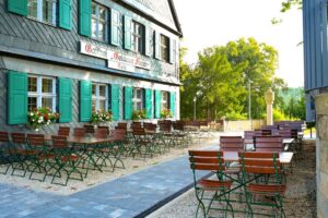 Ein kulinarisches Highlight bietet der Gasthof Goldener Hirsch, der das Ensemble mit fränkischer Küche und einem großzügigen Biergarten ergänzt. Ob festliches Gruppenessen, private Feier oder einfach ein genussvoller Abschluss eines erfüllten Tages – hier wird Gastfreundschaft gelebt und regionale Küche zelebriert.