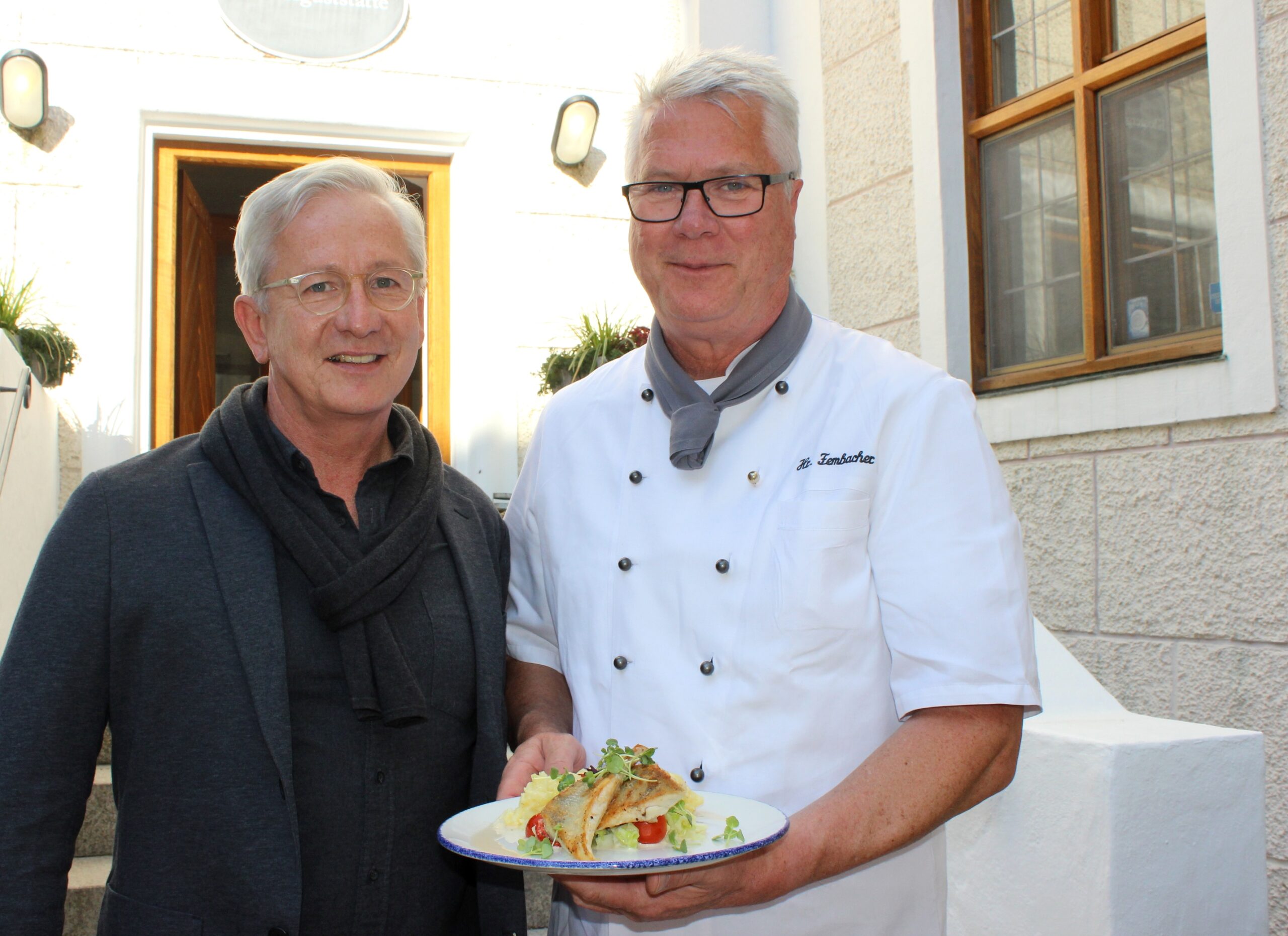 Foto: Der Geschäftsführer des Kultur- und Bildungszentrums Kloster Seeon Gerald Schölzel (links) und Küchenchef Dieter Fembacher mit einem besonderen Schmankerl: Gegrillter Zander aus dem Klostersee mit hausgemachtem Kartoffelstampf.