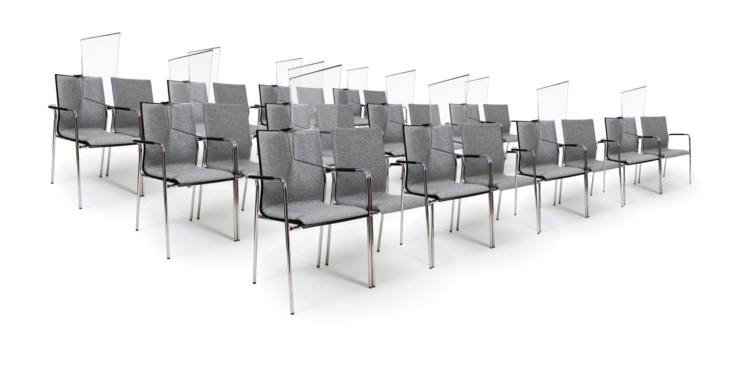 Bereits seit mehreren Jahren steht der Unternehmensverbund Schneeweiss Interior, zu dem Rosconi als Experte im Bereich von Premium-Accessoires für Lounge und Lobby gehört, im Rahmen seiner „Venue 4.0 Creative Labs“ im kommunikativen Austausch mit namhaften Akteuren der Branche und diskutiert in regelmäßigen Abständen, welchen individuellen Möblierungsanforderungen man sich als erfolgreicher Partner der Event- und Seminarwirtschaft stellen muss. Diese langjährige Expertise kam der Produktentwicklung des transparenten, mit einem Klick in Blickrichtung montierbaren Schutzsegels „Protect C1“ zu gute. Der Fokus lag dabei auf der Einhaltung des Mindestabstandes von 1,50 m zu anderen Personen und damit auf der Personendichte je Fläche. Für Locations ergibt sich ohne „Protect C1“ aufgrund einer durchschnittlichen Stuhlbreite von ca. 50 cm eine simple Formel für die Reiheneinteilung: Nur jeder vierte Stuhl darf mit einem Gast besetzt werden, dies bedeutet eine wirtschaftlich unrentable Auslastung in Höhe von 25%. Wird jedoch das Rosconi Schutzsegel mit Hilfe der smarten – je nach „C1“-Modell fix oder flexibel wählbaren – Montageklammer auf jeder zweiten Sitzgelegenheit angebracht, ist bereits eine Basisauslastung von 50% gegeben. Da aufgrund des Online-Ticketings bereits vor Veranstaltungsbeginn bekannt ist, ob Gästegruppen wie Familien, Partner oder zwei Haushalte gemeinsam platziert werden können, entfällt in diesen Fällen die Notwendigkeit eines Schutzes. Der Locationbetreiber generiert hier eine zusätzliche Auslastung von 20-30%, die on top auf die durch „Protect C1“ erreichte Basisauslastung von 50% hinzukommt.