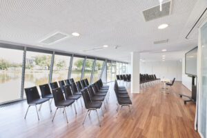 Besonderes Highlight: Die Konferenzräume der Kongresshalle Böblingen bieten nicht nur modernste Technik, sondern auch ein einzigartiges Ambiente mit direktem Blick auf den See. Individuell verschiebbare Trennwände ermöglichen flexible Raumgrößen von 20 bis 160 Personen. Große Fensterflächen sorgen für Tageslicht, sind aber bei Bedarf vollständig abdunkelbar – ideal für konzentriertes Arbeiten oder wirkungsvolle Präsentationen.