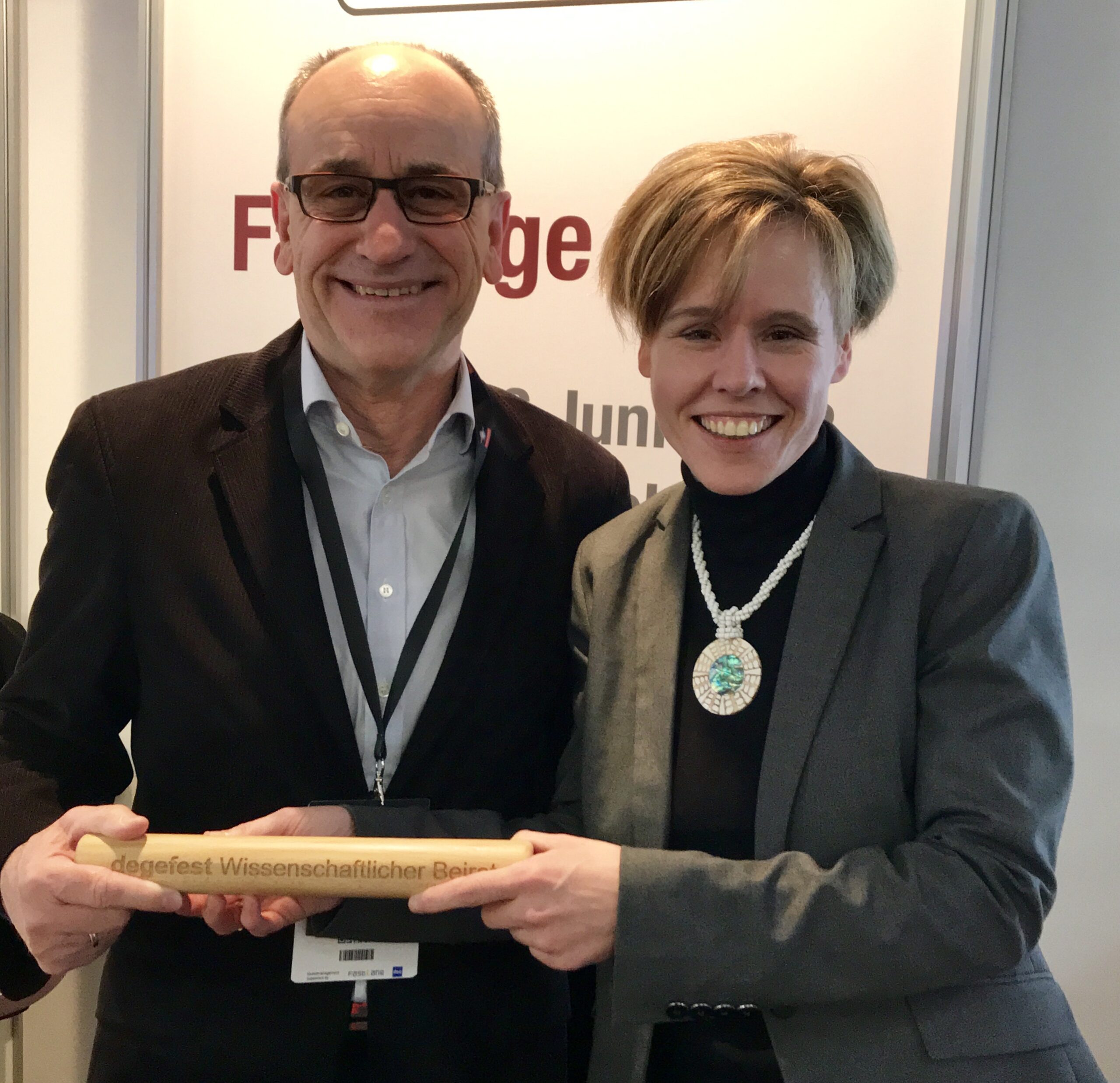 Der Staffelstab mit der Gravur „degefest Wissenschaftlicher Beirat“ wird nun für die nächsten 2 Jahre in Osnabrück beheimatet sein. Kim Werner freut sich auf den Vorsitz und die enge Zusammenarbeit mit Ihren Kollegen aus dem Wissenschaftlichen Beirat.